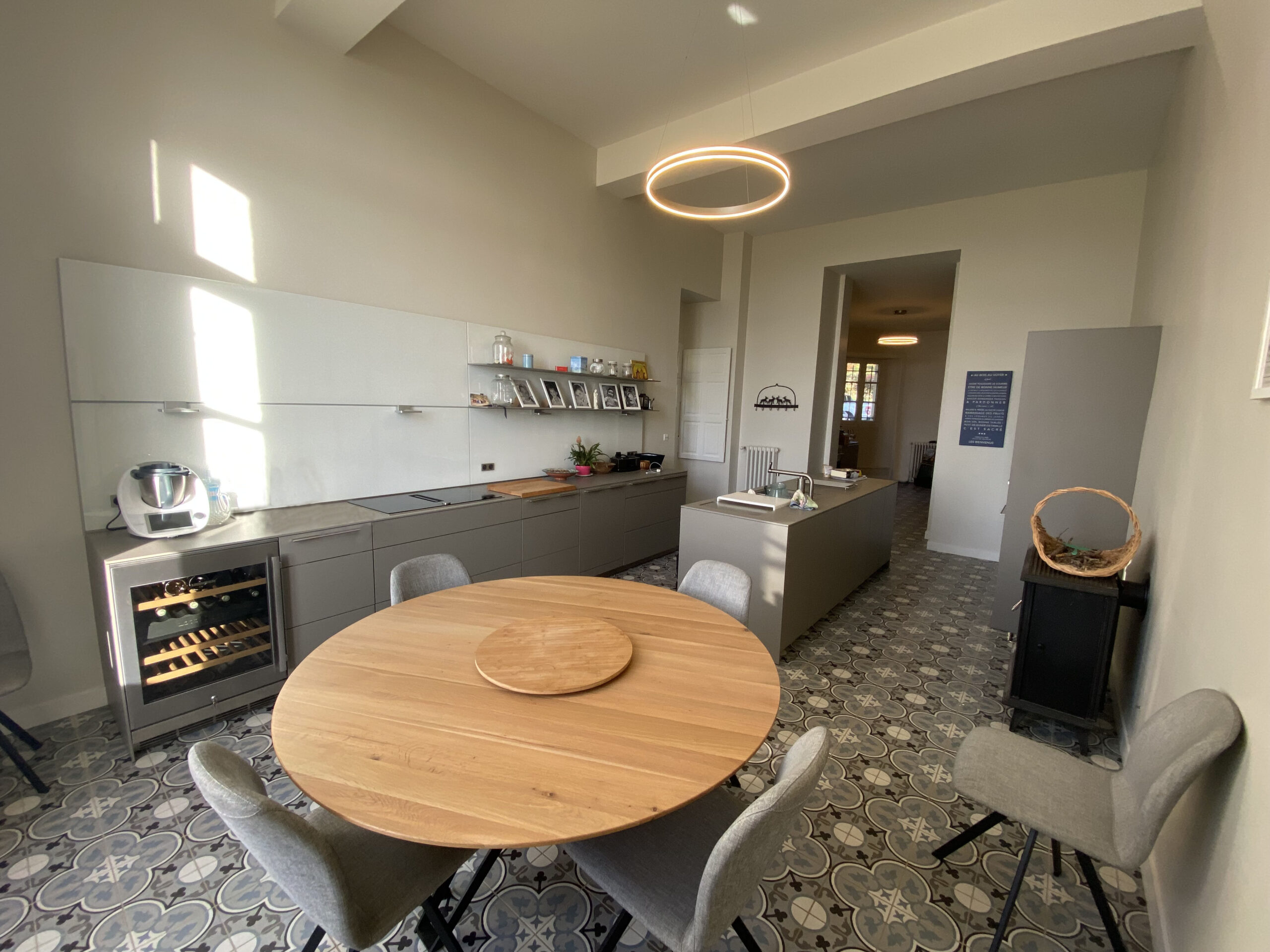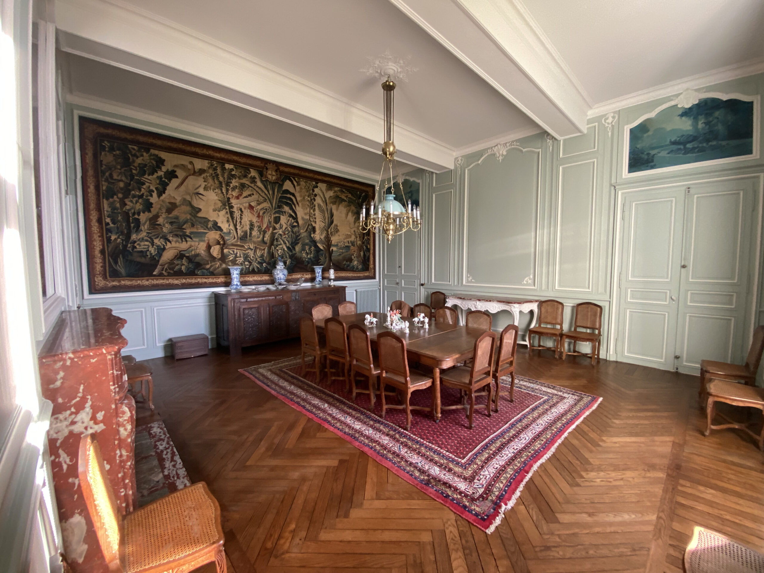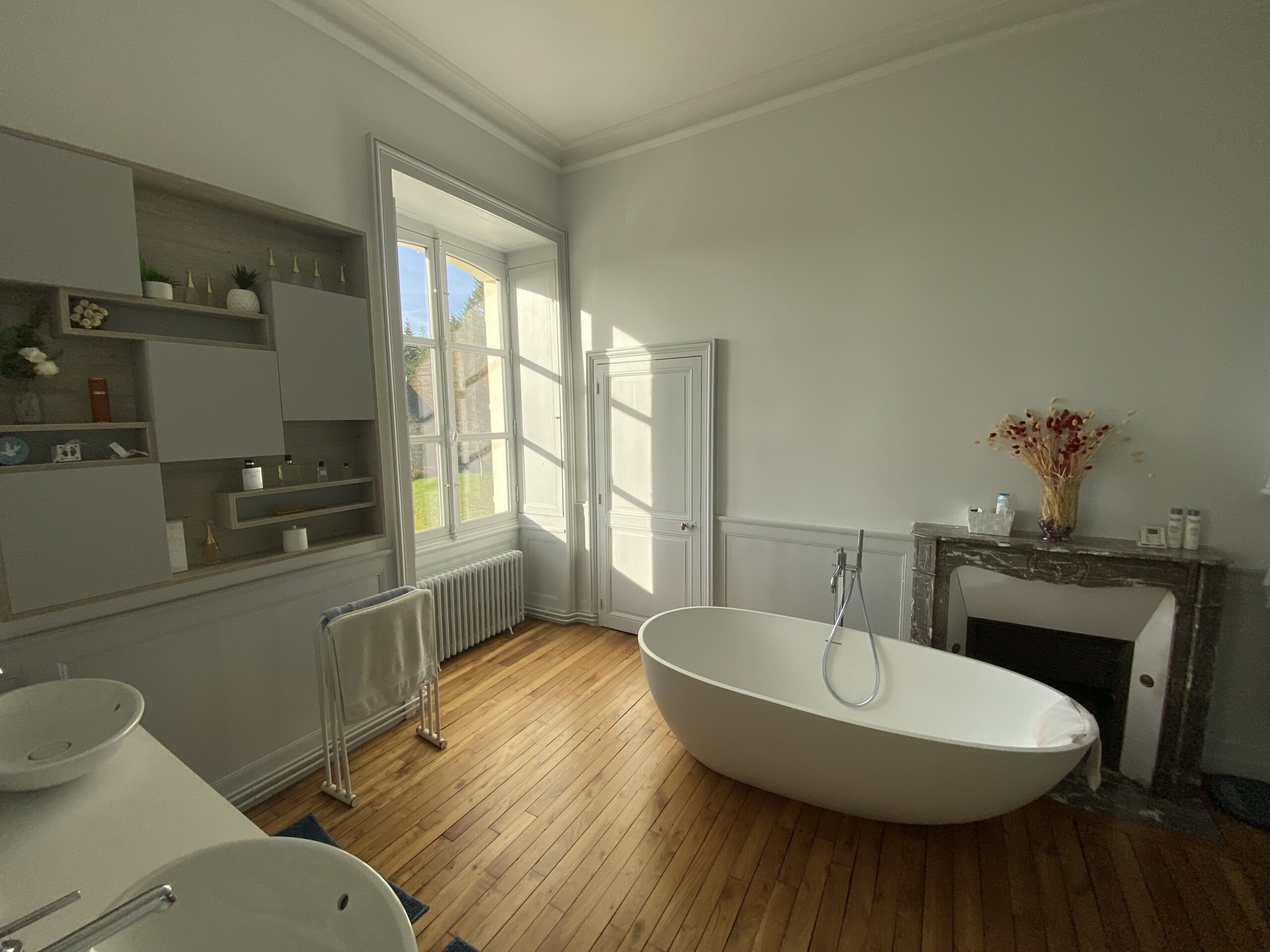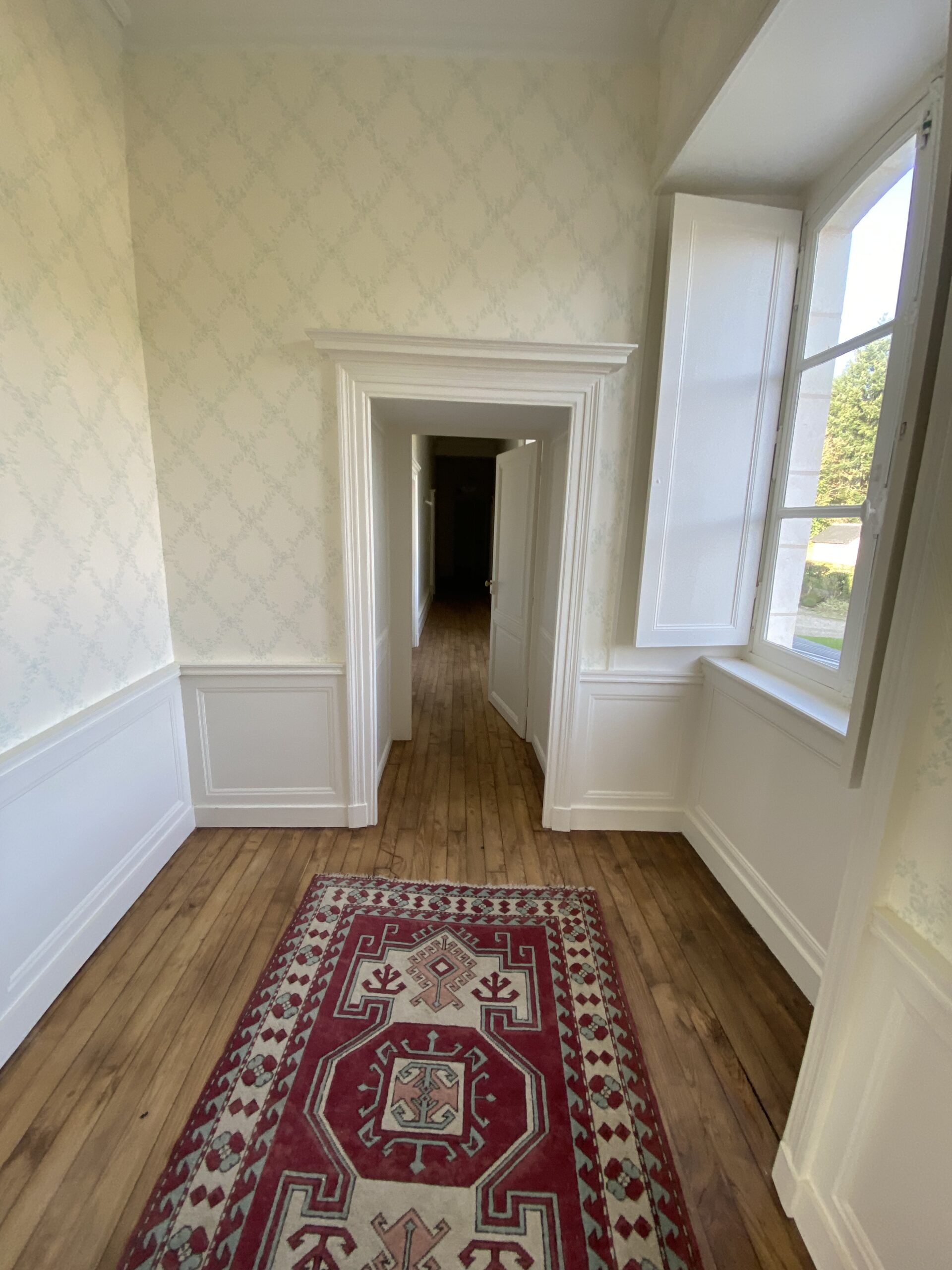 Dans ce château XVIIIème, les équipes réorganisent les espaces pour améliorer le confort quotidien. Désormais, chaque chambre dispose d’une salle de bains attenante ou privée. Ainsi, les volumes répondent aux exigences actuelles sans altérer l’existant. Par ailleurs, les techniciens étendent le chauffage jusqu’au deuxième étage. Cette adaptation assure une diffusion homogène dans toutes les pièces. Ensuite, les artisans restaurent les parquets avec méthode. Chaque surface est poncée puis protégée par une finition cirée. De cette manière, le bois retrouve éclat et durabilité. En complément, les peintres reprennent toutes les pièces avec des teintes adaptées. Certaines zones intègrent également des papiers peints pour enrichir les ambiances. Enfin, les équipes installent une cuisine contemporaine parfaitement intégrée. Elle associe fonctionnalité, esthétique et respect du caractère du château XVIIIème. Ainsi, le projet atteint un équilibre clair entre modernité et patrimoine.