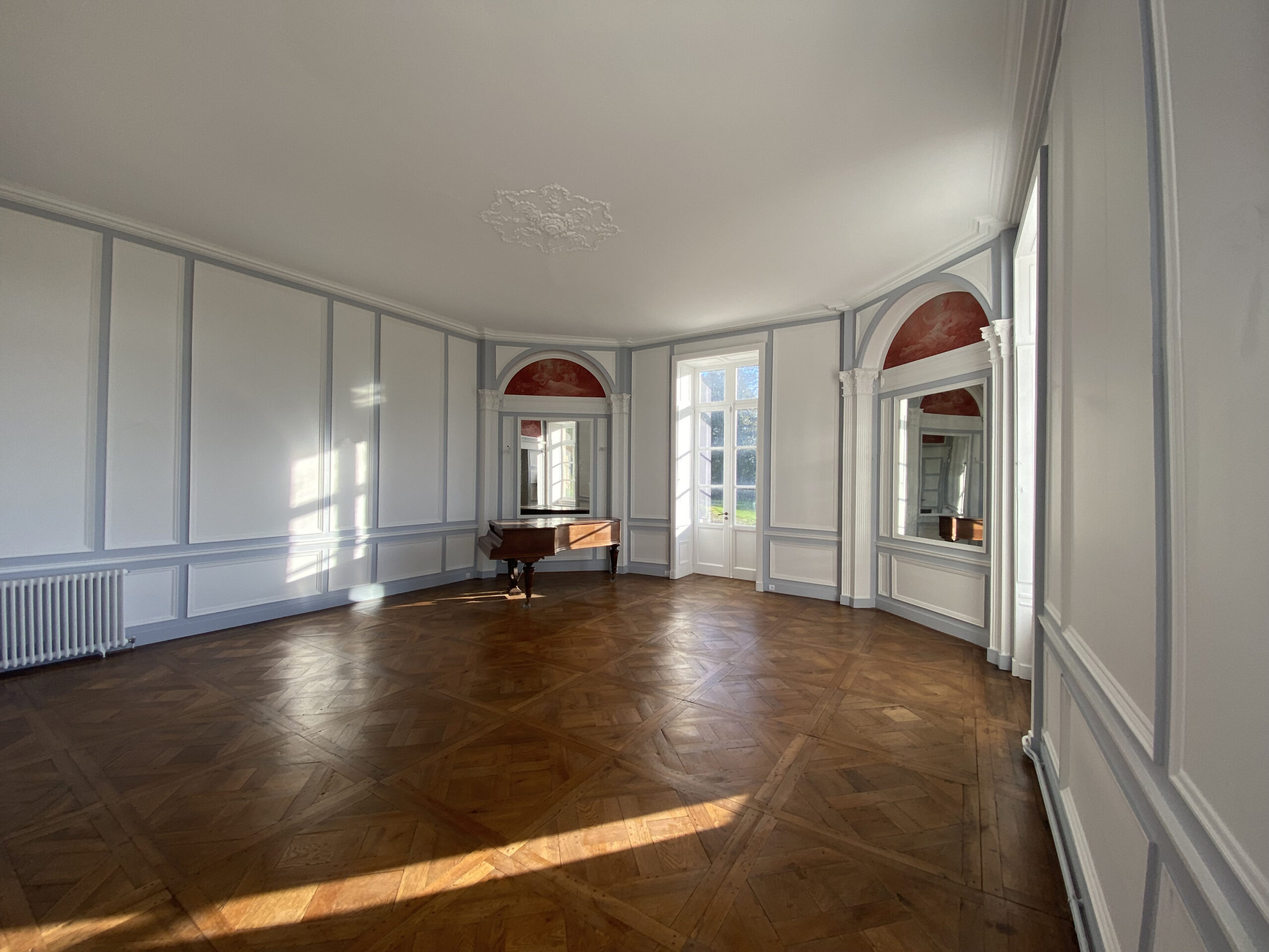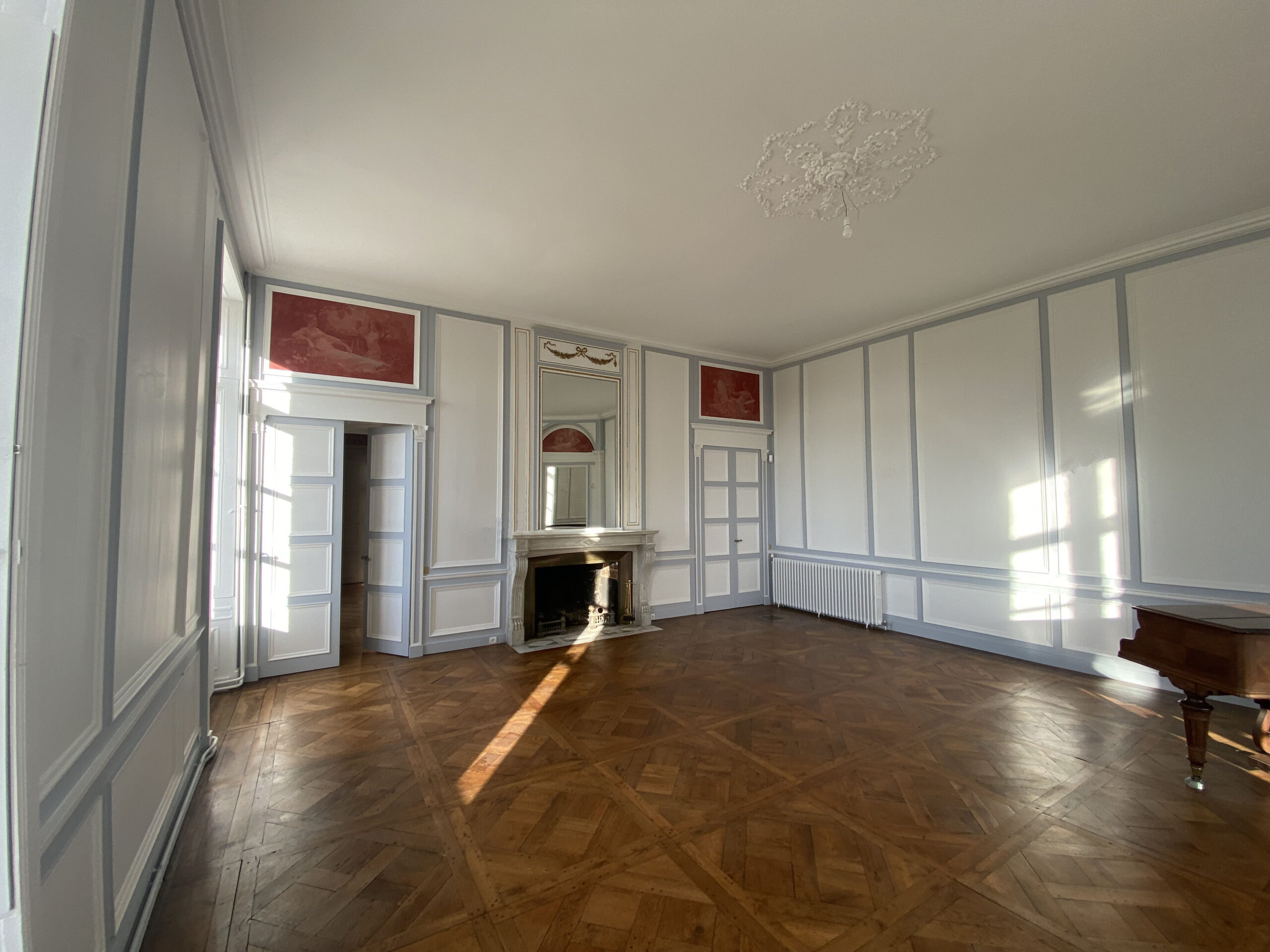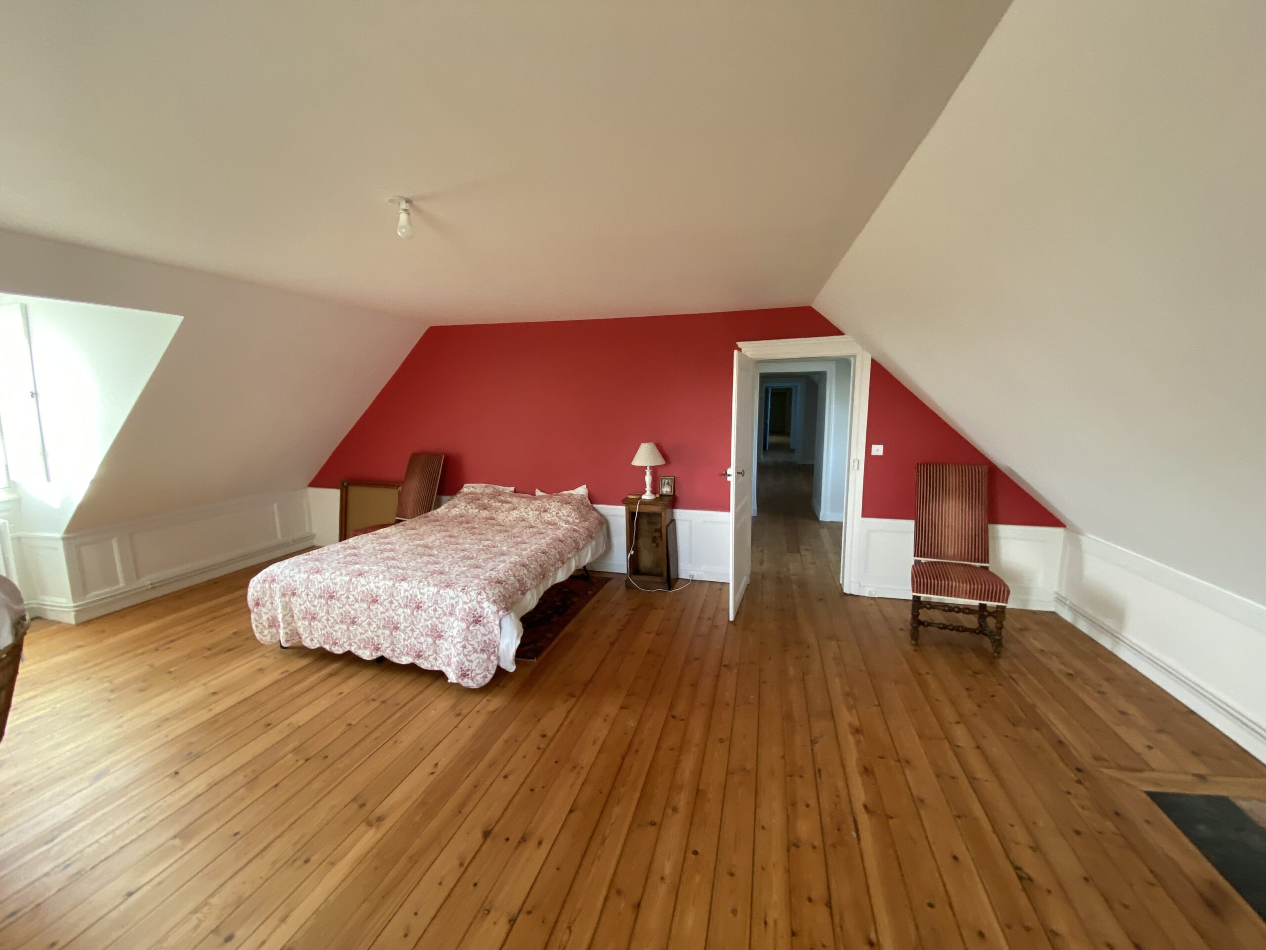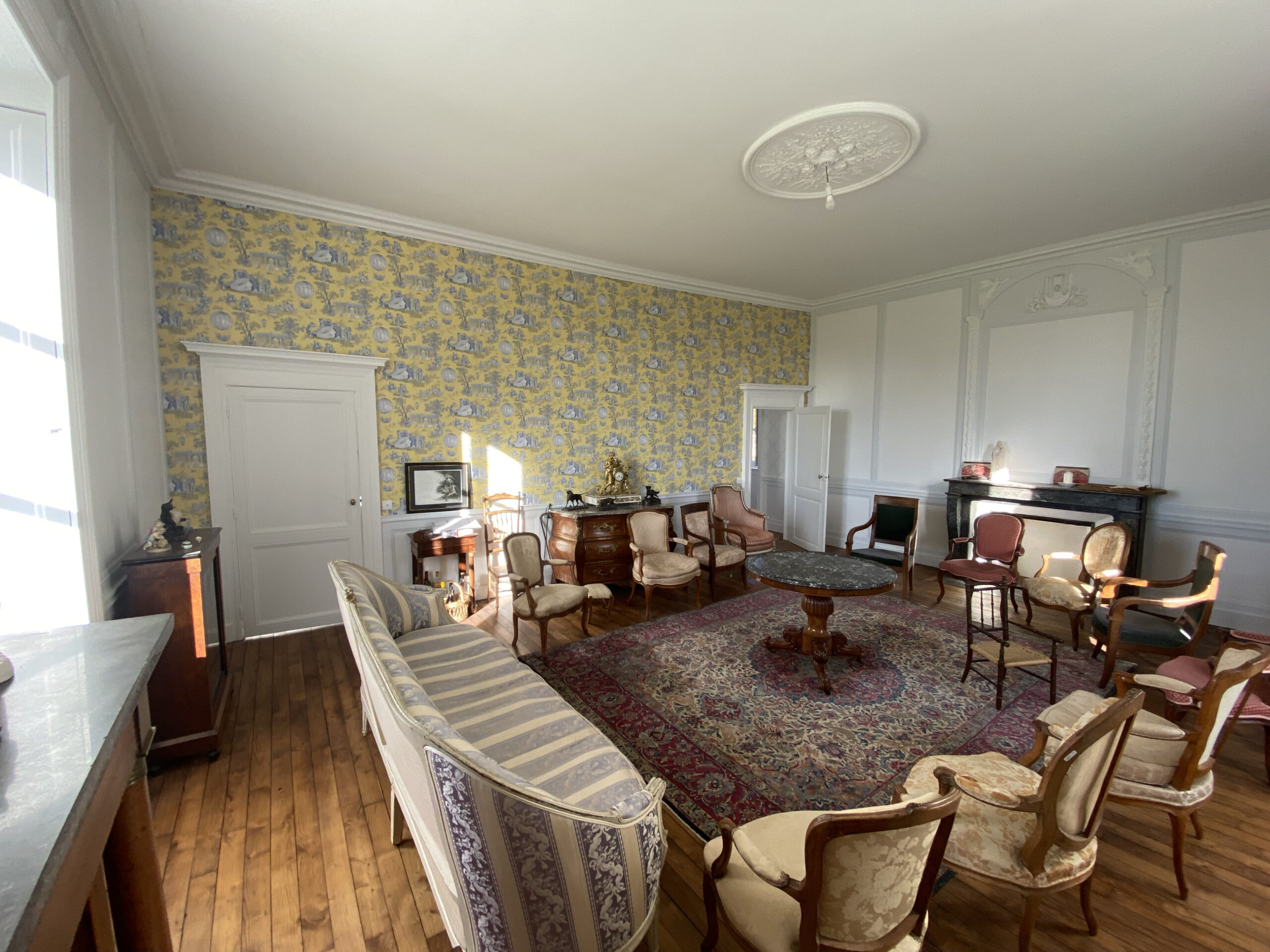 Dans ce château XVIIIème, les équipes réorganisent les espaces pour améliorer le confort quotidien. Désormais, chaque chambre dispose d’une salle de bains attenante ou privée. Ainsi, les volumes répondent aux exigences actuelles sans altérer l’existant. Par ailleurs, les techniciens étendent le chauffage jusqu’au deuxième étage. Cette adaptation assure une diffusion homogène dans toutes les pièces. Ensuite, les artisans restaurent les parquets avec méthode. Chaque surface est poncée puis protégée par une finition cirée. De cette manière, le bois retrouve éclat et durabilité. En complément, les peintres reprennent toutes les pièces avec des teintes adaptées. Certaines zones intègrent également des papiers peints pour enrichir les ambiances. Enfin, les équipes installent une cuisine contemporaine parfaitement intégrée. Elle associe fonctionnalité, esthétique et respect du caractère du château XVIIIème. Ainsi, le projet atteint un équilibre clair entre modernité et patrimoine.