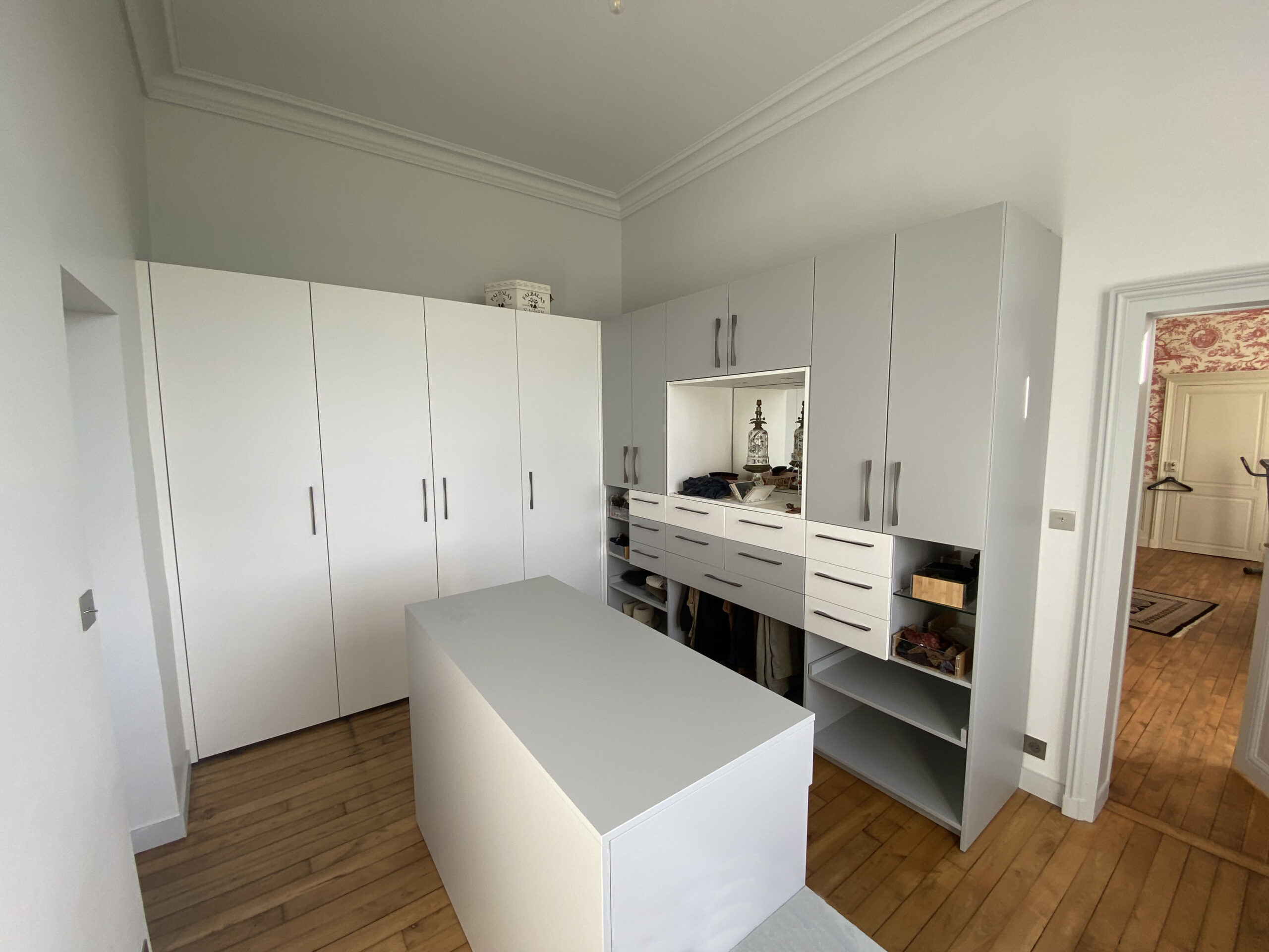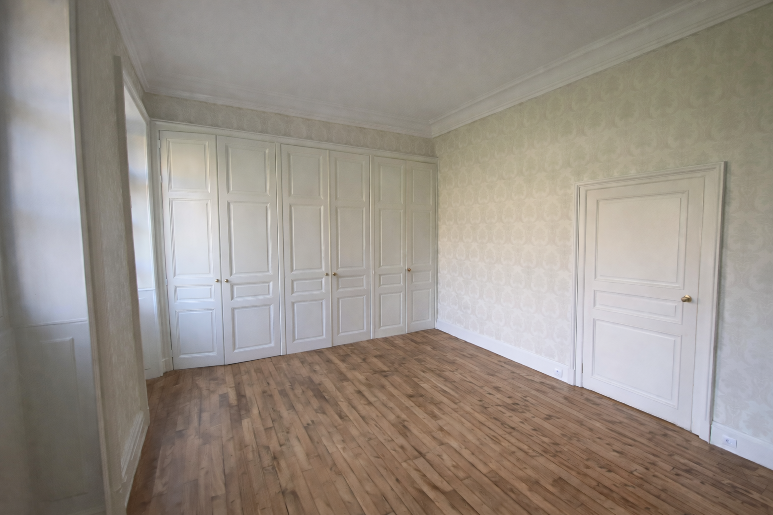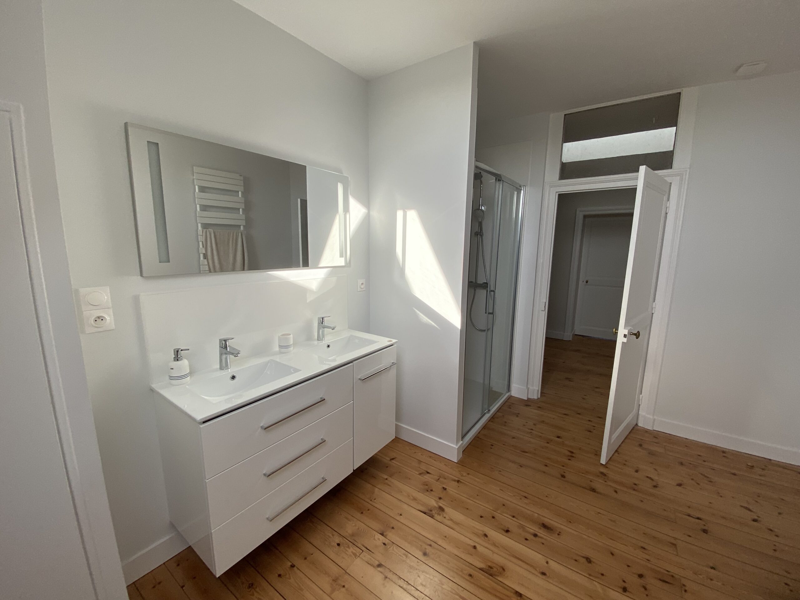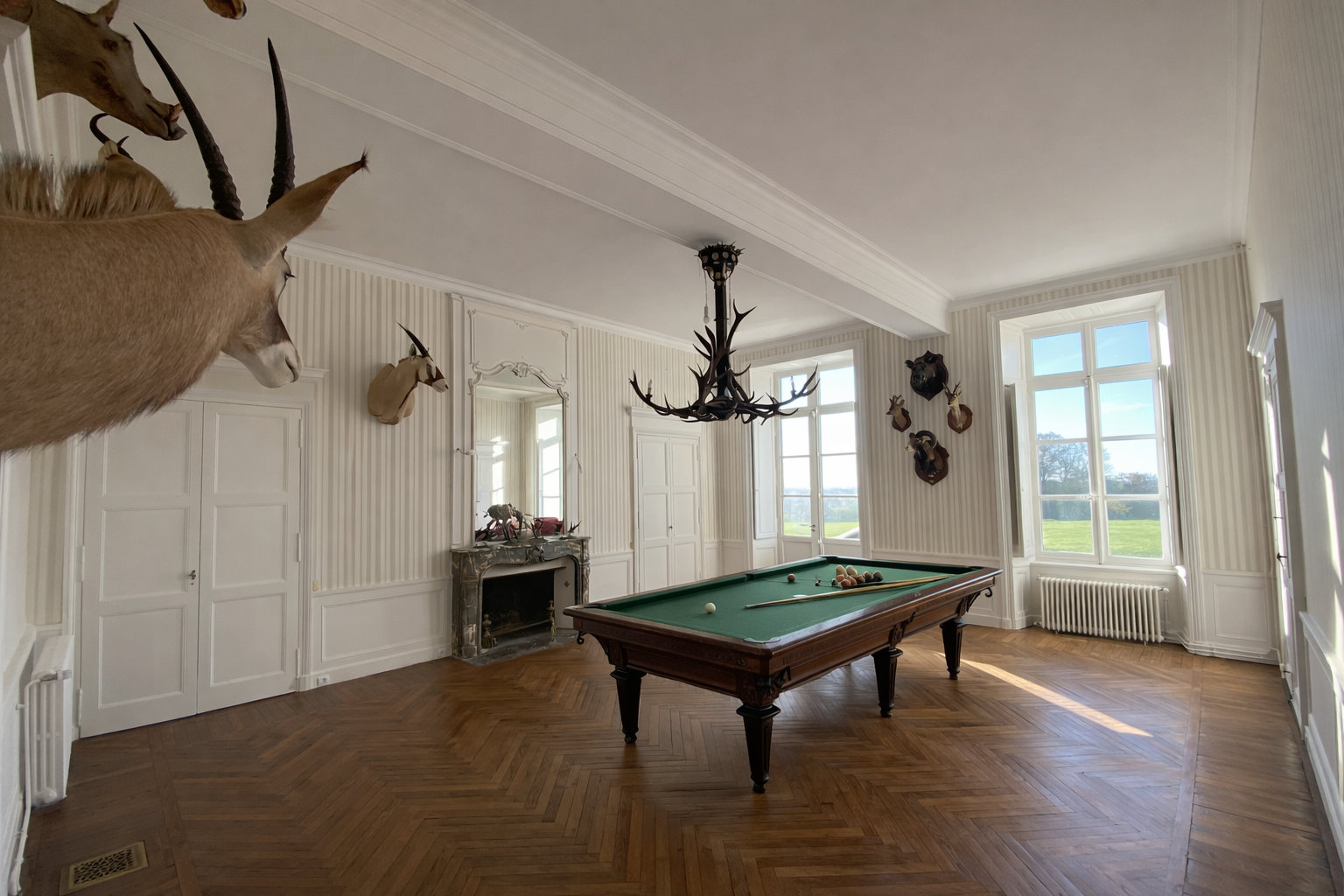Dans ce château XVIIIème, les équipes réorganisent les espaces pour améliorer le confort quotidien. Désormais, chaque chambre dispose d’une salle de bains attenante ou privée. Ainsi, les volumes répondent aux exigences actuelles sans altérer l’existant. Par ailleurs, les techniciens étendent le chauffage jusqu’au deuxième étage. Cette adaptation assure une diffusion homogène dans toutes les pièces. Ensuite, les artisans restaurent les parquets avec méthode. Chaque surface est poncée puis protégée par une finition cirée. De cette manière, le bois retrouve éclat et durabilité. En complément, les peintres reprennent toutes les pièces avec des teintes adaptées. Certaines zones intègrent également des papiers peints pour enrichir les ambiances. Enfin, les équipes installent une cuisine contemporaine parfaitement intégrée. Elle associe fonctionnalité, esthétique et respect du caractère du château XVIIIème. Ainsi, le projet atteint un équilibre clair entre modernité et patrimoine.